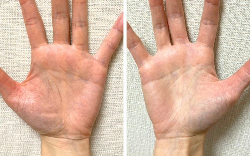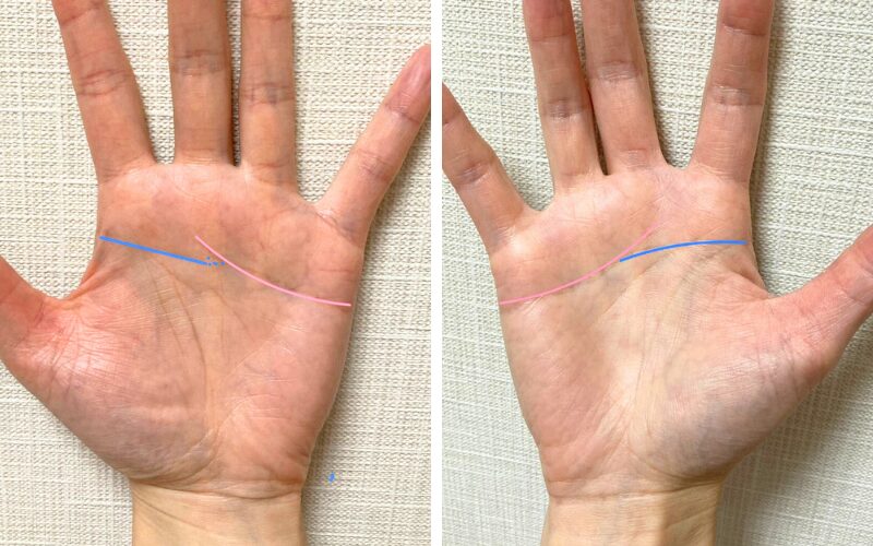 ①左右ともに、青の知能線が親指側から伸びて、ピンクの感情線が小指側から伸びて、知能線と感情線が接している↓↓↓