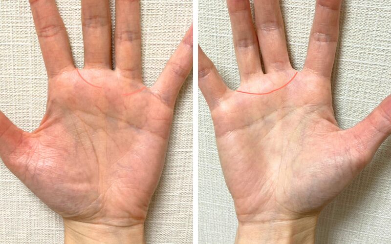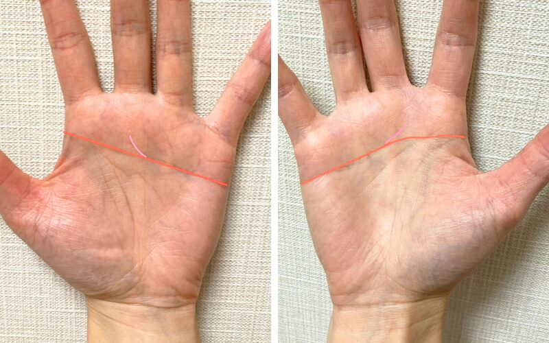 と、最初から一本線で観ようとせず、知能線・感情線を別々で捉えた後、俯瞰した目で手のひら全体を観て、一本線(マスカケ線)になるか確認して、線や相を読んでいくと分かりやすいです。