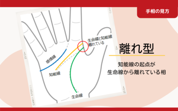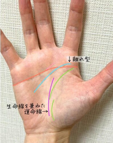 右手の2本目の知能線(水色)は、生命線からもマスカケ線からも離れた独立独歩の離れ型です。