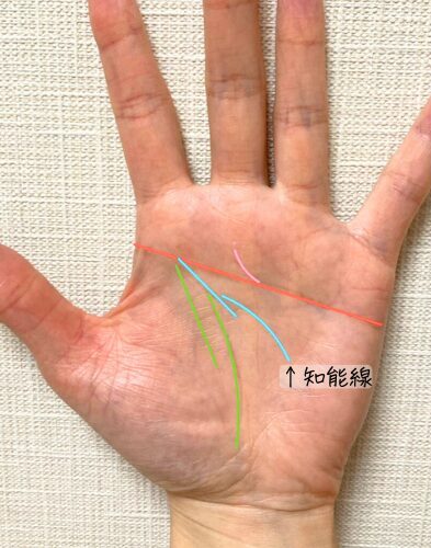 左手の知能線(水色)は、生命線にくっついて2段階で伸びています。