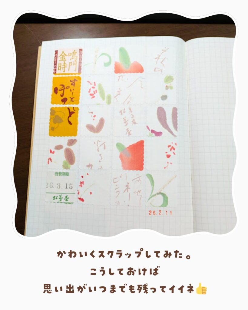 せっかく作ったので、頂いたKさんに、このスクラップ写真を送ってみれば、すごく喜んでくれて、食べて楽しみ、貼って楽しみ、見せて楽しむことができました。