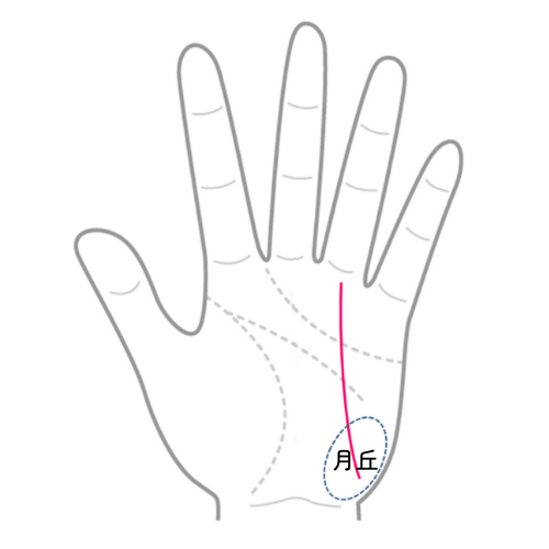月丘は故郷や実家・身内を意味する金星丘(親指側)と対になる場所で、故郷・実家から離れた場所や他人との縁の深さを現す。